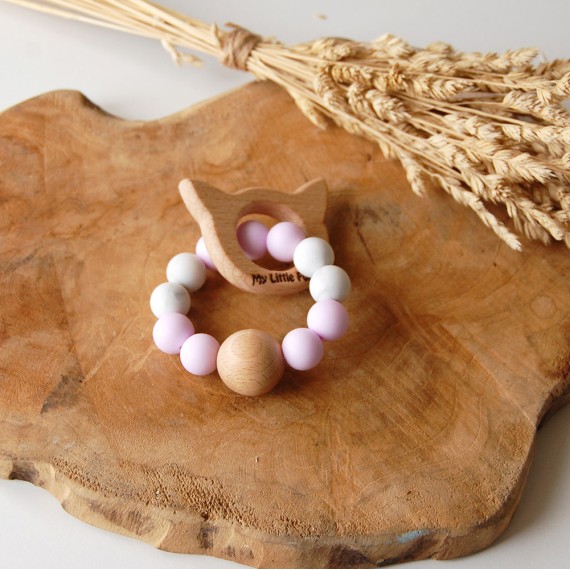 Hochet de dentition en bois et perles en silicone alimentaire.